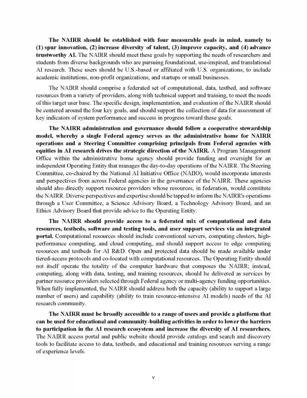 NAIRR应该包括来自各种提供商资源的一组联合的计算、数据、测试床和软件,以及技术支持和培训,以满足需求这个目标用户群。NAIRR的具体设计、实施和评估应以四个关键目标为中心,并应支持收集数据以评估实现这些目标过程中的系统性能和成功的关键指标。