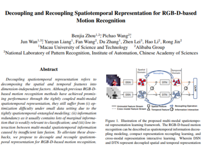 在行为识别领域,虽然当前的一些基于RGB-D模态的动作识别方法可以取得显著效果,但是他们都是建立在时空紧密耦合架构的基础上进行的时空信息建模。因此,这些方法主要存在以下三个问题:(1)由于时空建模过程的紧密耦合,导致在一些小数据集上面临一定的优化困难;(2)网络中包含的大量与分类无关的边缘冗余信息可能会误导分类器做出错误的决策;(3)视频多模态信息之间缺乏有效的时空交互导致后验融合机制不能充分发挥其作用。所以在本文中,我们提出了一种有效建模时空信息的解耦与重耦合机制以及一种新颖的RGB-D多模态时空信息交互策略。具体来讲,我们将多模态时空信息建模过程分成三个子任务:(1)通过解耦时空建模网络实现高质量维度无关的时间和空间表征学习。(2)重新耦合这些解耦的时空表征以重新建立强时空依赖。(3)引入一种新的跨模态时空信息交互方案和自适应后验融合机制(CAPF)来深度融合RGB-D多模态时空信息。通过充分利用以上技术,可以实现更加鲁棒的时空表征学习。