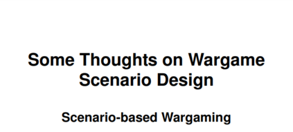 场景设计者的目标是创造一个类似于历史上实际发生的情况,或者一个与历史相似的情况。玩家扮演历史上的指挥官,面对与他们的目标相冲突的其他玩家的反对,他们必须利用现有的资源来实现目标和克服挑战。如果将这些行动置于更大的背景中,那么这些目标的实现对玩家来说就会更有意义,这类似于19世纪初冯-赖斯维茨的 "Kriegsspiel "提出的 "通用想法",它被广泛认为是现代历史兵棋的鼻祖;也就是说,应该向玩家提供一个围绕桌面上所描绘的特定情况的后果框架,为他们的决策提供背景。对于那些能够构成可行合理历史场景的情况类型,一个很好的资源是赫尔穆特-冯-毛奇的《1858年至1872年的战术问题》。