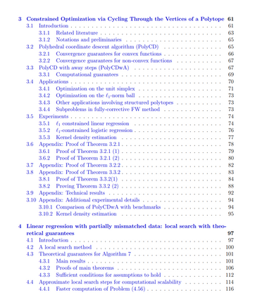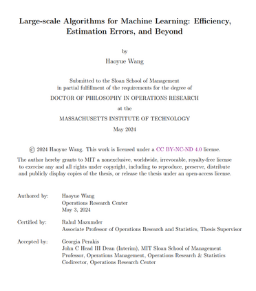 优化算法是机器学习和统计推断的基石。随着大规模数据集的出现,计算挑战日益增加,迫使人们追求更高效的算法。现代优化技术通常针对特定的机器学习问题进行定制,这些方法利用问题的独特结构特征,使其比当前应用于这些问题的方法效率更高。另一个关键方面是理解所得到估计量的估计精度。在某些情况下,尽管在训练集上实现精确优化可能不切实际,但某些简单而有效的启发式方法在适当的统计框架内可以表现出令人赞叹的估计精度。 在本文中,我们从优化和统计的角度研究了几种大规模算法。第2章和第3章研究了两种针对结构约束的连续优化算法。第2章集中讨论了具有圆柱形约束的无界约束的一种广义Frank-Wolfe方法。第3章则研究了具有少量极点的多面体约束的类似坐标下降(CD)方法。这两种方法由于对问题结构的敏感性而表现出最先进的性能。 第4章研究了一种带有解释器-响应对之间可能存在不匹配的线性回归变体。我们研究了一种简单且高效的启发式方法,并在统计环境中对其估计误差进行了严格分析。 第5章和第6章研究了两种决策树算法。第5章研究了最优决策树的计算,并引入了一种新的分支定界方法,用于具有一般连续特征的最优决策树。第6章则转向在足够杂质减少条件下对CART算法的分析。我们为满足该条件的信号函数证明了严格的误差界,并讨论了一些满足该条件的函数类。 第7章研究了一种具有形状约束的密度估计问题。我们提出了一种立方-牛顿法框架用于计算,并研究了有限混合的逼近性质。