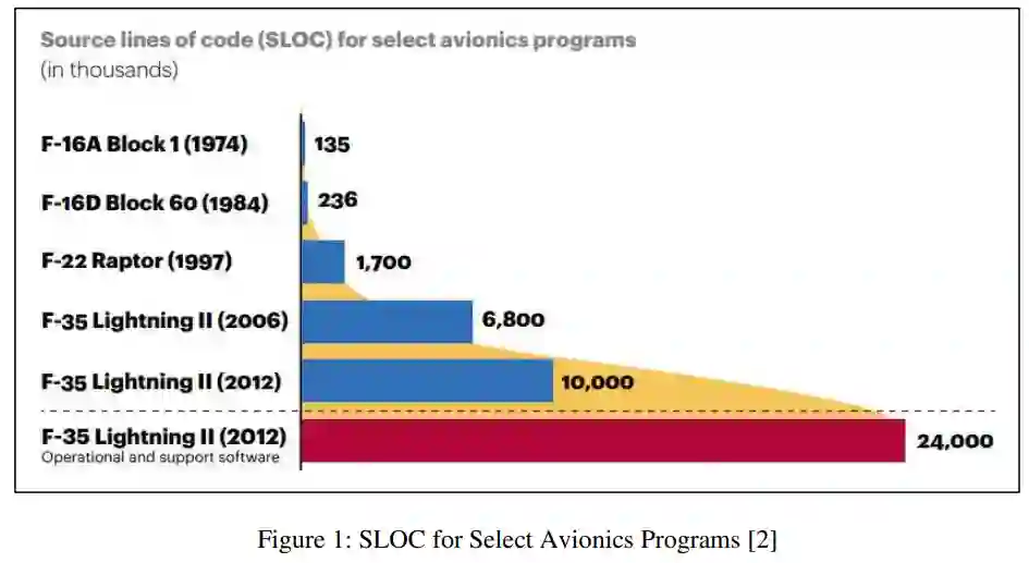 测试是系统或产品开发生命周期的重要组成部分。适当的验证和确认工作有助于确保产品按预期开发并满足客户需求。美国国家航空航天局(NASA)估计,测试工作占大型航空航天项目软件开发总成本的 75% 至 88%。如下图 1 所示,高度复杂的系统需要极其庞大的源代码基线(例如,截至 2012 年,F-35 战斗机和支持软件的源代码行数(SLOC)总计超过 2400 万行),这就需要大量的测试工作来进行适当的验证。