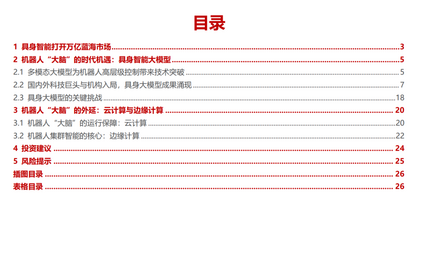 具身智能大模型为机器人“大脑”的核心。具身智能需要本体、智能体、数据、学习和进化架构四大核心要素,通用机器人本体又可以分为“大脑”、“小脑”和“肢体”三部分,其中,人形机器人“大脑”的核心为人工智能大模型技术,通过多模态模型建模、强化学习、地图创建和数据训练,能够管理和协调机器人的各种功能。大模型目前较为擅长需求理解、任务分解等高层级控制任务,规划级以下的控制规划属于传统机器人控制规划的范畴,更适合传统机器人更成熟的高频控制方法。多模态大模型为机器人高层级控制带来技术突破。多模态大模型具有理解图像、场景文本、图表、文档以及多语言、多模态理解的强大能力,可以直接用于具身智能对环境的理解,并通过提示词使之输出结构化内容如控制代码、任务分解等指令语言、图片、视频等。 国内外科技巨头与研究团队入局,具身大模型成果涌现。谷歌、特斯拉、微软、英伟达、李飞飞团队、特斯拉、字节跳动等国内外科技巨头和科研机构争相入局,具身大模型成果不断涌现:谷歌推出RT-1、PaLM-E、RT-2、RT-X等多个具身大模型;特斯拉坚持端到端算法路线,实现感知决策一体化并迁移至人形机器人;英伟达推出物理AI开发平台Nvidia Cosmo及一系列世界基础模型;国内大厂字节GR-2在动作预测和泛化能力上表现出色。 具身大模型目前在泛化性、实时性、数据采集等方面存在挑战。当前的具身大模型通常存在泛化能力弱的问题,已经在特定场景达成较高成功率的模型在切换至不同场景时成功率大幅降低。实时性较差则体现在输出运动频率较低,使得机器人反射弧较长,低于人类和许多实际应用场景的需求。数据采集方面的挑战则体现在真实数据收集效率偏低、收集难度和成本偏高,合成数据的使用中则需要避免生成数据与真实数据差距过大或者样式单一。 云计算与边缘计算作为“大脑”的外延,保障机器人“大脑”高效运转。云计算是为机器人等终端设备提供算力的核心方式,云计算能够为AI、大模型与机器人的结合提供强大的计算能力和数据存储空间,以及能够随时随地获得所需资源和算法支持的灵活性、可拓展性;此外,边缘计算为云计算的数据传输成本、时延、安全性等方面的局限性提供了补充,为具身智能人形机器人落地保驾护航。
