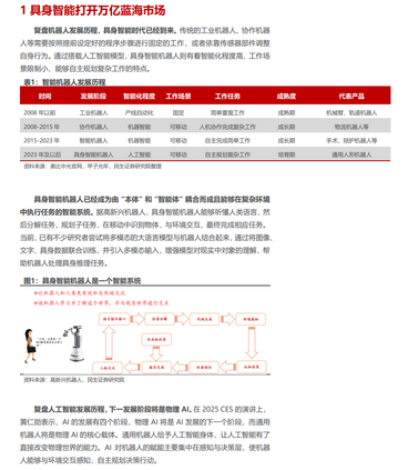 具身智能有望开启万亿级蓝海市场。在当前时点复盘机器人与人工智能的发展历程,机器人已经进入具身智能时代,与此同时,人工智能也将走向“物理AI”发展阶段。人形机器人是两者汇聚的交点,也是具身智能时代的临界点,有望成为新一代智能终端,并开启万亿级蓝海市场。