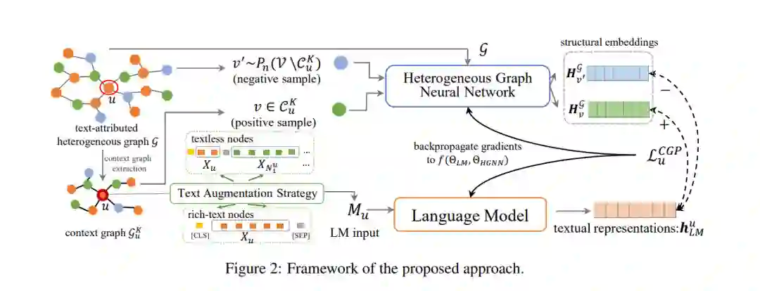 在许多实际情况中(例如,学术网络、社交平台),不同类型的实体不仅与文本关联,而且还通过各种关系相互连接,这可以被抽象为文本属性异构图(TAHGs)。当前的语言模型(LMs)预训练任务主要集中在分开学习每个实体的文本信息,并忽视了捕捉TAHGs中实体之间的拓扑关系的重要方面。在这篇论文中,我们提出了一个新的针对LMs的预训练框架,明确地考虑TAHGs中的拓扑和异构信息。首先,我们定义了一个上下文图为特定顺序内的目标节点的邻域,并提议一个拓扑意识的预训练任务,通过联合优化LM和一个辅助的异构图神经网络来预测参与上下文图的节点。其次,基于观察到一些节点文本丰富,而其他节点文本很少的现象,我们设计了一种文本增强策略,通过其邻居的文本来丰富没有文本的节点,以处理不平衡问题。我们在三个来自不同领域的数据集上进行链接预测和节点分类任务。实验结果证明了我们的方法相对于现有方法的优越性和每种设计的合理性。我们的代码可在以下链接找到:https://github.com/Hope-Rita/THLM。