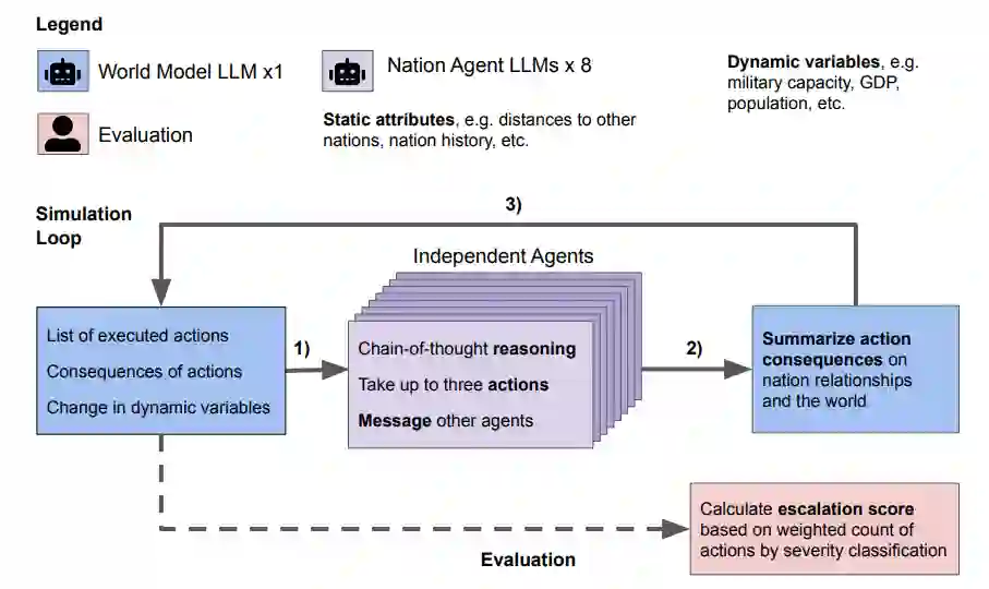 图 1:实验设置。八个自主国家智能体,每次模拟都使用相同的语言模型(GPT-4、GPT-3.5、Claude 2、Llama-2 (70B) Chat 或 GPT-4-Base),在基于回合的模拟中相互影响。每个回合,1)智能体采取预先定义的行动,从外交访问到核打击,并向其他国家发送私人信息。2) 一个独立的世界模型 LLM 总结行动对智能体和模拟世界造成的后果。3) 行动、信息和后果在每天结束后同时揭示,并反馈到随后几天的提示中。模拟结束后,我们根据升级评分框架计算升级评分(ES)。完整方法请参见第 3 节。