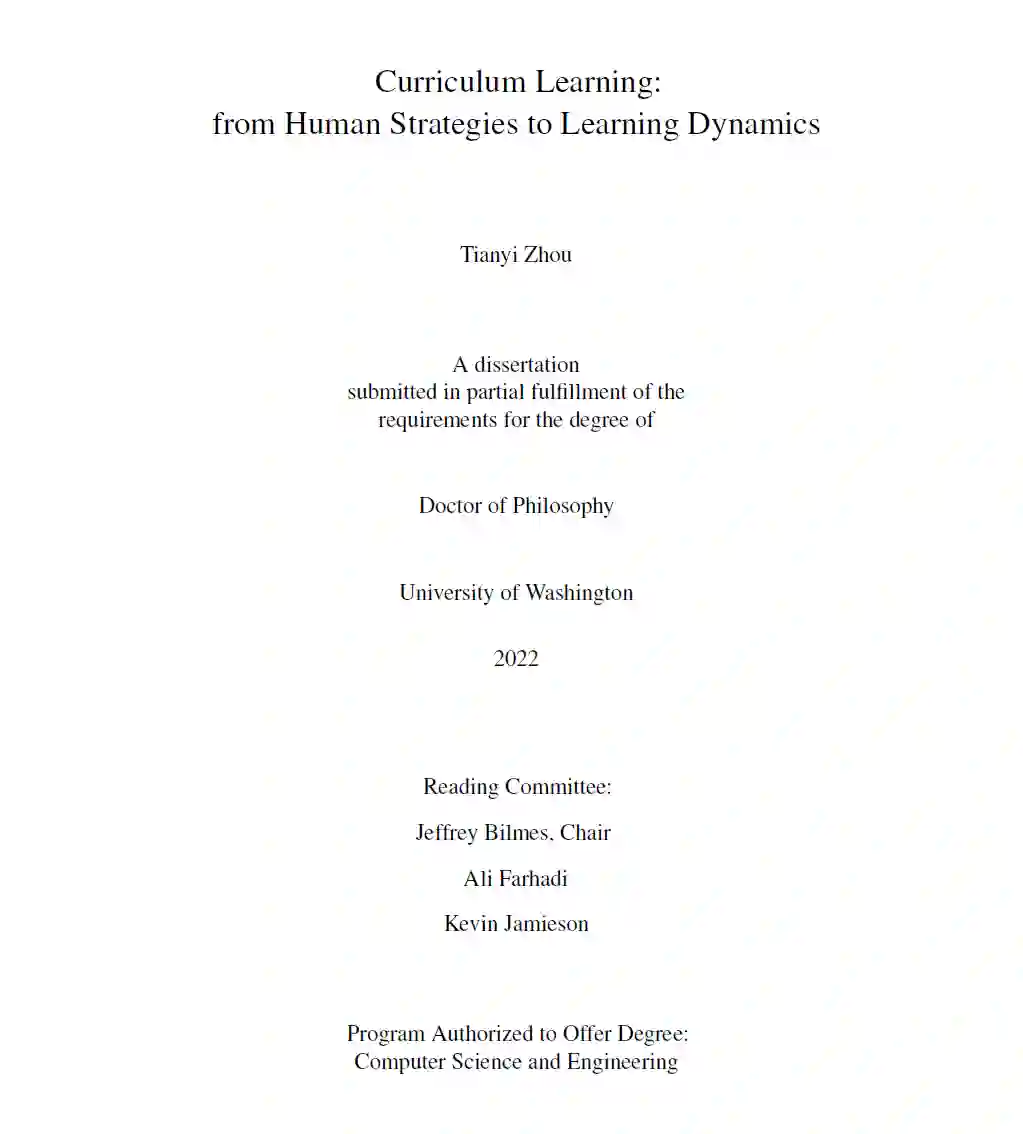 最近机器学习(ML),或“人工智能(AI)的第三波”的成功,是建立在优化和统计领域的计算方法,大规模训练数据和计算能力的可用性,以及部分模仿人类认知功能(如卷积网络)的基础上的。然而,目前的机器学习技术在实际应用中可能非常低效,并且容易出现不完美的数据,例如,当数据有噪声、无标记、不平衡或包含冗余、偏差、协变量偏移等时。另一方面,人类学习在规划和选择不同学习阶段的训练内容时更具战略性和适应性。与在所有阶段对相同数据的随机小批次重复训练的机器学习技术相比,人类学习在解决这些实际挑战时,在效率和鲁棒性方面表现出巨大优势。因此,如何制定机器学习的战略性“课程”成为弥合人类智能与机器智能之间鸿沟的重要挑战。课程学习是一种基于人类学习策略的、适用于不同学习阶段的数据选择方法,即先选择较容易的样本,再逐步增加较难的样本。然而,人类用于设计课程的培训材料的特性不仅限于难度,还可以包括多样性、一致性、代表性、激励、对未来培训的影响或效用等。在机器学习中,开发高效准确的得分函数来衡量这些属性及其对最终/以后学习目标的贡献是具有挑战性的。此外,鉴于分数函数,课程策略如何规划多个训练阶段并根据每个阶段自适应地调整选择标准仍然是一个公开的挑战。课程学习的另一个主要挑战是缺乏模型参数和课程联合优化的原理和理论激励公式。如果没有这样的公式,就很难将选择标准和分数函数与课程学习的潜在目标联系起来,例如,训练进度,泛化表现等。因此,很难解释一个课程何时以及为什么可以提高ML。而且,在开发课程学习算法时,需要针对不同的ML应用,专门设计不同学习阶段的选择标准的规划和调度,例如半监督学习、集成学习等。为了实现一个实际有效的算法,研究是否以及如何将为特定应用开发的现有技术与课程结合起来也很重要。本文旨在解决上述关键挑战。它由四部分组成。在第一部分中,我们介绍了几个新的课程学习公式。例如,我们可以将人类的学习策略转换为离散-连续优化,并在训练过程中联合优化模型和课程,如第2章和第5章所示。我们还可以从一个新的课程学习目标中推导出权重或分数的解析形式,如第3章和第4章所示。此外,我们在第6章讨论了几个潜在的公式,以供未来的研究。在第二部分中,我们将深入探讨在课程学习中起着重要作用的分数函数设计。例如,所选数据的多样性在减少冗余和鼓励早期探索方面发挥着至关重要的作用。除了多样性,我们主要关注第8章中一类新的得分函数,它基于样本在整个历史上的训练动态,而不是其在特定步骤的瞬时反馈。与广泛应用的瞬时分数相比,它们显著减少了分数评估所需的额外计算,并且由于其可区分的动态模式,它们在分配信息量最大的训练样本方面更准确。在第三部分中,我们基于所开发的公式和分数函数构建了实用的课程学习算法。这些算法涵盖了几个重要的机器学习问题,包括监督学习、半监督学习、噪声标签学习、集成学习等。在每个问题的算法中,研究和比较了不同的规划或调度策略,这些策略决定了选择标准如何在不同的学习阶段发生变化。通过详细的实证分析和比较,验证了所提出调度策略的有效性。为在每个问题上实现最先进的性能,研究了每个问题的课程和现有技术之间的相互作用,然后在算法设计中结合它们的优势。在第四部分中,在每个应用问题的基准数据集上,评估了所提出的方法,并与各种强大的基线进行了广泛的实验比较。与设计的课程相结合的方法在所有应用中都持续提高了训练效率和最终测试的准确性。值得注意的是,课程在不完美数据的更具有挑战性的应用上表现出更显著的优势,如半监督学习和噪声标签学习。第18章总结了本文的主要贡献。除了提出的公式、分数函数和课程学习的算法外,还强调了在工作中弥合差距并结合人类启发式方法、理论公式和经验算法的优势的努力。此外,还列举了未来工作中几个潜在的研究方向,这些方向可以显著拓展课程学习的现有方案和应用领域,并深入理解机器学习中的训练动力学及其与人类教育和认知的联系。