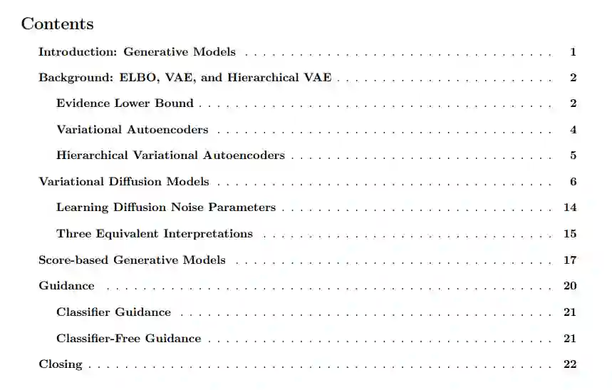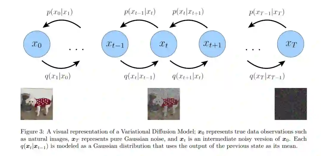 请允许我们总结一下我们在探索过程中的发现。首先,我们推导了变分扩散模型作为马尔可夫层次变分自动编码器的特殊情况,其中三个关键假设使ELBO的可跟踪计算和可扩展优化成为可能。然后,我们证明优化VDM可以归结为学习一个神经网络来预测以下三个潜在目标之一:来自任意噪声化的原始源图像,来自任意噪声化图像的原始源噪声,或在任意噪声水平上的噪声化图像的评分函数。然后,我们深入研究评分函数的含义,并明确地将其与基于评分的生成模型的视角联系起来。最后,我们将介绍如何使用扩散模型学习条件分布。