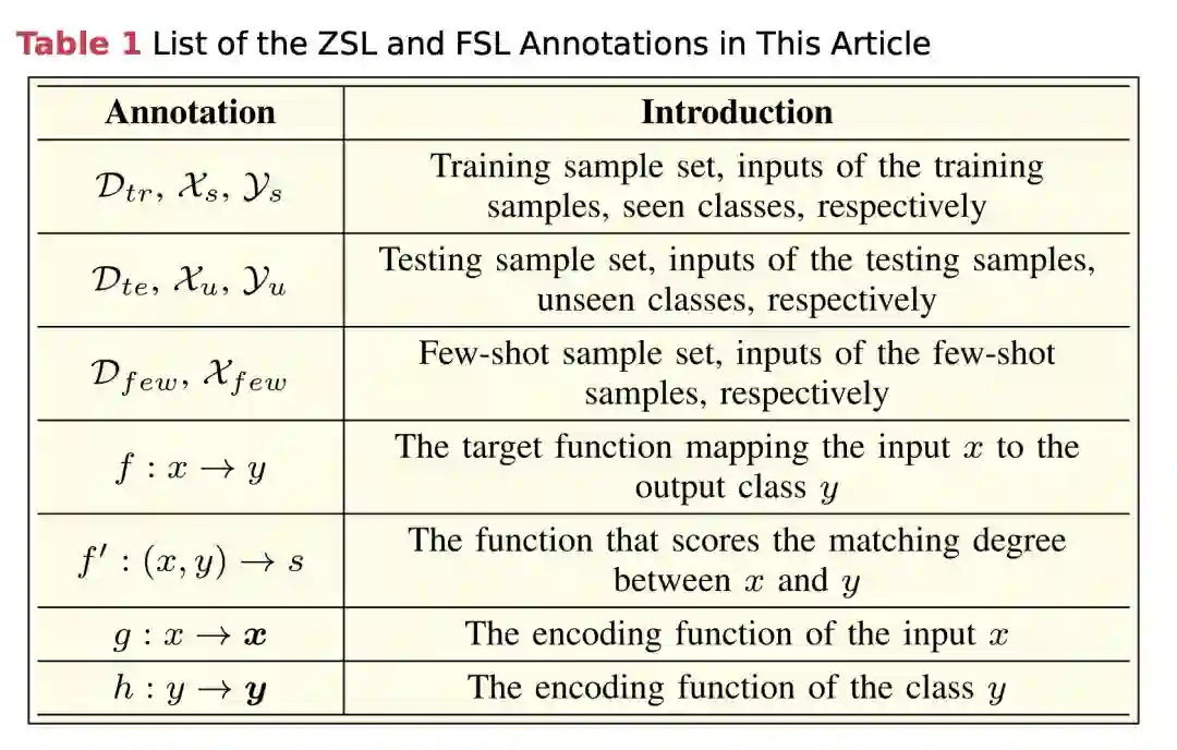 - ZSL的正式定义: ZSL旨在使用训练样本集 训练函数 来预测测试集 上的样本,其中测试样本的类别 与训练样本的类别 不相交,即 。