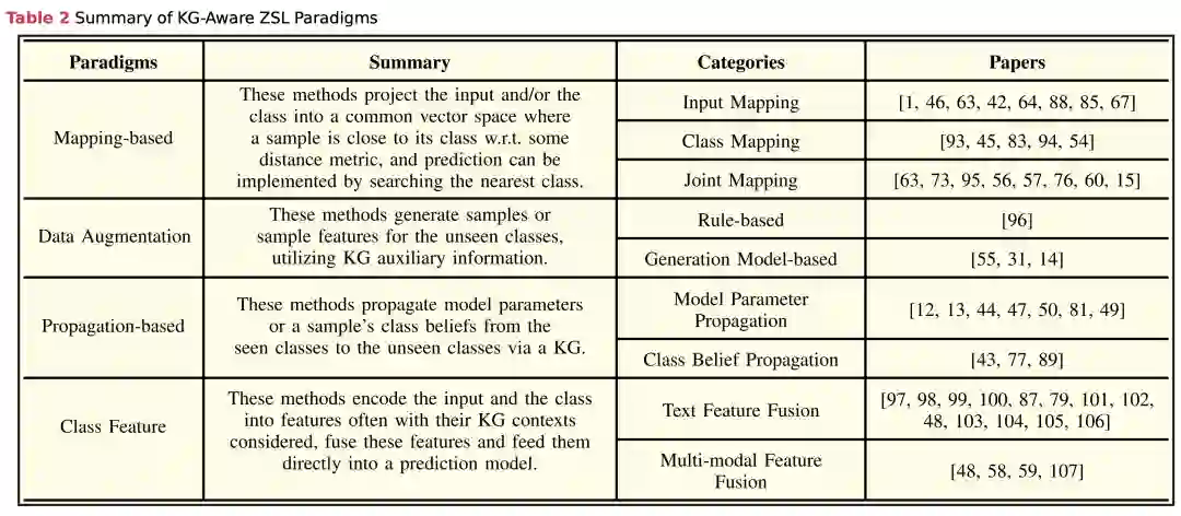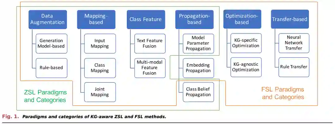- 系统分类和总结: 文章首先介绍了ZSL和FSL中使用的知识图谱及其构建方法,然后系统地分类和总结了知识图谱感知的ZSL和FSL方法,这些方法被分为不同的范式,如基于映射、数据增强、基于传播和基于优化等。