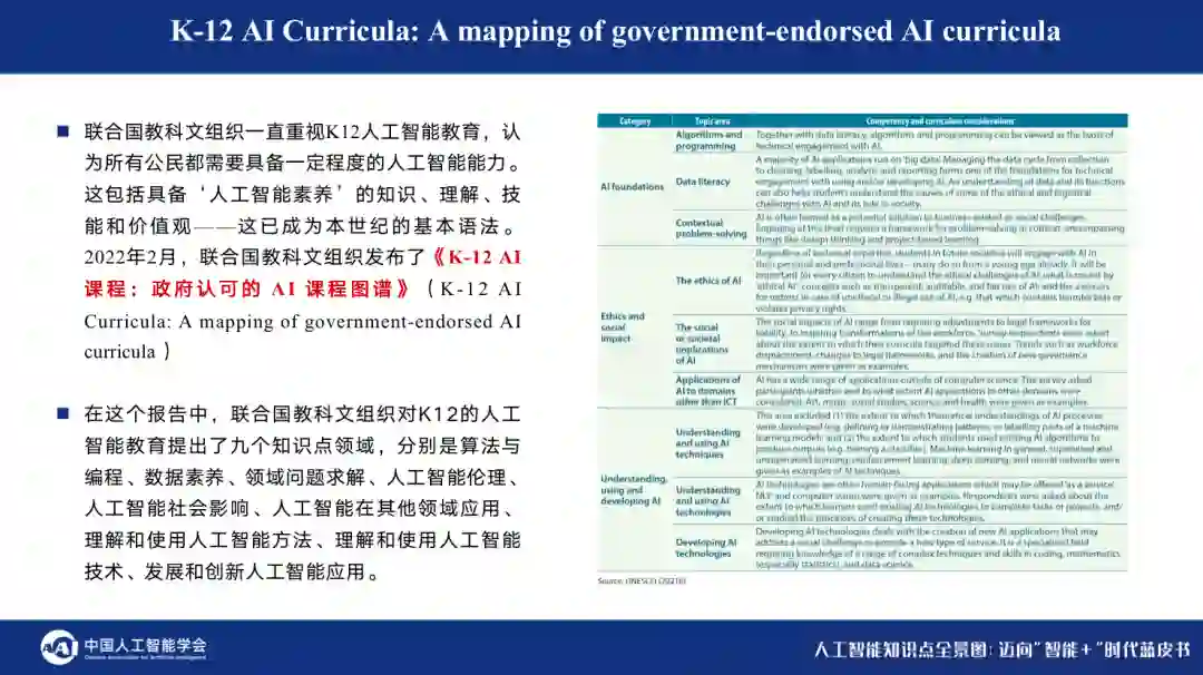2022年2月,联合国教科文组织发布了《K-12 AI课程:政府认可的AI课程图谱》,这是关于K-12人工智能课程全球状况的第一份报告。在这份报告中,联合国教科文组织对K12的人工智能教育提出了九个知识点领域,分别是算法与编程、数据素养、领域问题求解、人工智能伦理、人工智能社会影响、人工智能在其他领域应用、理解和使用人工智能方法、理解和使用人工智能技术、发展和创新人工智能应用。