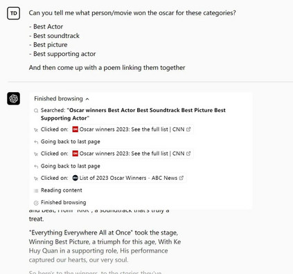 下图是一个例子,可以看到的是,浏览为 ChatGPT 用户打开了一种体验,以前的模型可能会礼貌地指出它的训练数据没有包括足够的信息让它回答。而在这个例子中,ChatGPT 检索了最近的奥斯卡奖信息(在 2023 年 3 月 13 日颁奖),然后进行了一番熟悉的 ChatGPT 诗歌表演。浏览成为了一种附加体验的方式。