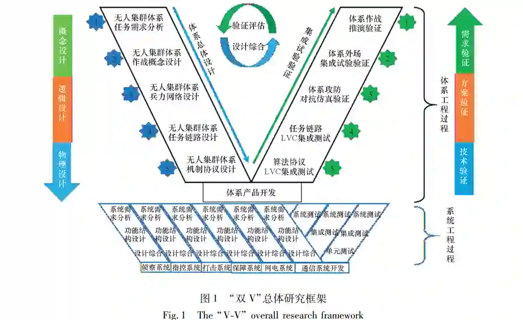无人集群作战正在成为一种改变战争形态的新型作战样式。针对当前无人装备试验相对独立、缺乏一体化闭环设计与集成验证手段的问题,提出了一种体系设计与仿真评估方法。该方法包含了作战概念建模与需求分析、体系设计理念与体系设计、内场仿真实验与方案探索、体系原型研发与评估优化、外场集成试验与综合决策五个阶段,创新发展了体系设计、仿真试验、评估优化的理论方法、工具链路、集成环境,为无人集群的体系化、智能化、实战化提供了一定的理论与技术支撑。 颠覆性技术,近年来在世界范围内得到了飞速发 展,已经成为国家间军事博弈的重要力量。随着 人工智能、机器学习、计算能力等技术的发展,未 来战场智能化程度将极大提高,进而促使无人体 系的深入发展[3] 。人机混合增强智能、自主无人 操控、群体智能决策等先进技术将成为军队战斗 力跃升的新的引爆相比于单个无人平台,无人集群具有更强的 环境适应能力和更高的效费比,对未来战争可能 产生重大影响[4] :第一,改变对抗形态[5] 。无人 集群的广泛运用,促使信息化战争对抗形态呈现 智能对抗、群体对抗、全域对抗、多维对抗等特 点[6] 。第二,变革作战样式。科学技术催生出新 的兵力编制和武器装备,进而导致作战样式和作 战理念的变革。无人集群的应用,也将进一步提 高无人装备的比例,逐渐呈现“人机一体”“无人 引导”“饱和打击”等的作战形式[7] 。第三,创新 战法战术。军事技术的发展直接影响战法战术, 而无人集群的应用将催生出更多全新的战法战 术,甚至颠覆传统观念。 无人集群体系是以数量优势弥补单一平台 功能或能力不足的一种无人作战体系,其核心 思想是将传统昂贵的大型有人平台分解为数量 更多、尺寸更小、成本更低的分布式无人作战平 台。