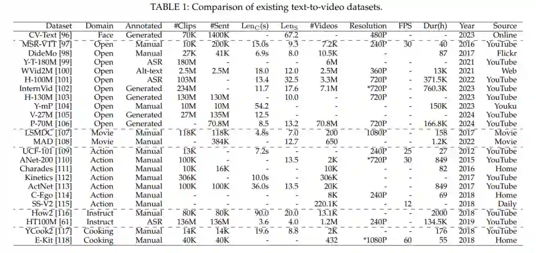 结论 基于对Sora的分解,本综述对当前文本生成视频(T2V)工作进行了全面回顾。具体来说,我们从生成模型演变的角度组织了文献,涵盖了基于GAN/VAE、自回归和扩散的框架。此外,我们深入审查了文献,基于优秀视频应具备的三种关键品质:延长的持续时间、卓越的分辨率和无缝的质量。此外,鉴于Sora被称为真实世界模拟器,我们展示了一个包含动态运动、复杂场景、多物体和合理布局的现实全景。此外,常用的视频生成数据集和评估指标根据其来源和应用领域进行了分类。最后,我们识别了一些T2V领域剩余的挑战和问题,并提出了未来发展的潜在方向。
