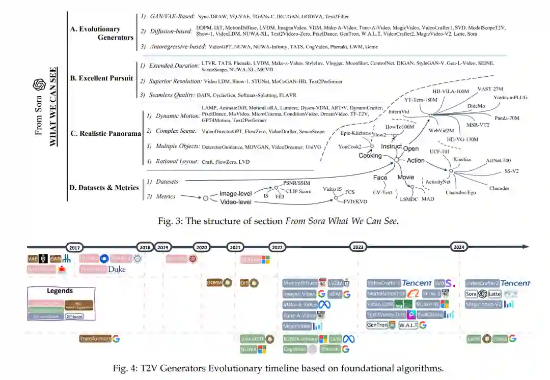 因此,在本节中,我们将从Sora尤其是T2V生成领域中获得的关键见解系统地分类为三个主要类别,并对每个类别进行详细回顾:进化生成器(见第3.1节)、卓越追求(见第3.2节)、现实全景(见第3.3节)以及数据集和评估指标(见第3.4节)。全面的结构如图3所示。