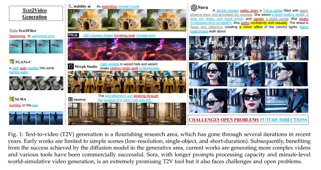 随着文本生成图像技术的重大突破,人类开始探索更具挑战性的文本生成视频领域,该领域能够传达和封装更丰富的视觉信息。尽管近年来这一领域的研究进展较为缓慢,但Sora的推出极大地重燃了希望,标志着一个重要的转折点,为该领域注入了新的活力。