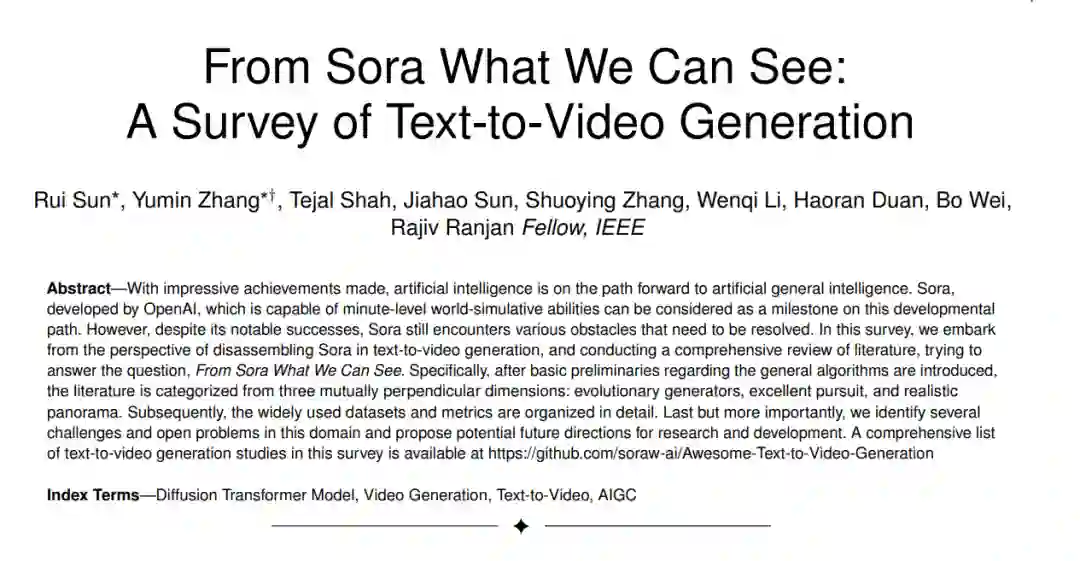 尽管人工智能已经取得了令人瞩目的成就,但其正向通用人工智能的道路上前进。由OpenAI开发的Sora具备分钟级的世界模拟能力,可被视为这一发展路径上的一个里程碑。然而,尽管取得了显著成功,Sora仍然面临着需要解决的各种障碍。在本综述中,我们从Sora在文本生成视频方面的视角出发,进行文献的全面回顾,试图回答一个问题:我们能从Sora中看到什么。具体来说,在介绍了基本的通用算法之后,我们从三个相互垂直的维度对文献进行了分类:进化生成器、卓越追求和现实全景。随后,对广泛使用的数据集和评估指标进行了详细整理。最后但同样重要的是,我们识别了该领域的若干挑战和开放性问题,并提出了未来研究和发展的潜在方向。本综述中的文本生成视频研究的完整列表可在以下链接找到: