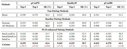 本文中,作者首次提出了 MSA 配对算法 ColAttn,该算法把蛋白语言模型的输出组合成联合 MSAs 形式,利用 MSA Transformer 中的注意力得分从单链中识别配对同源物。该方法在异二聚体上展现了最好的结构预测准确率。作者同时把 ColAttn 与其他的 MSA 配对算法进行结合,准确率得到了进一步提升。