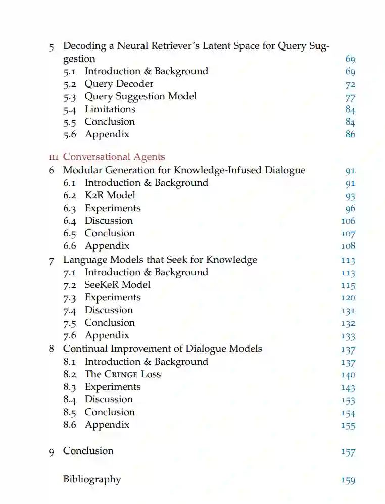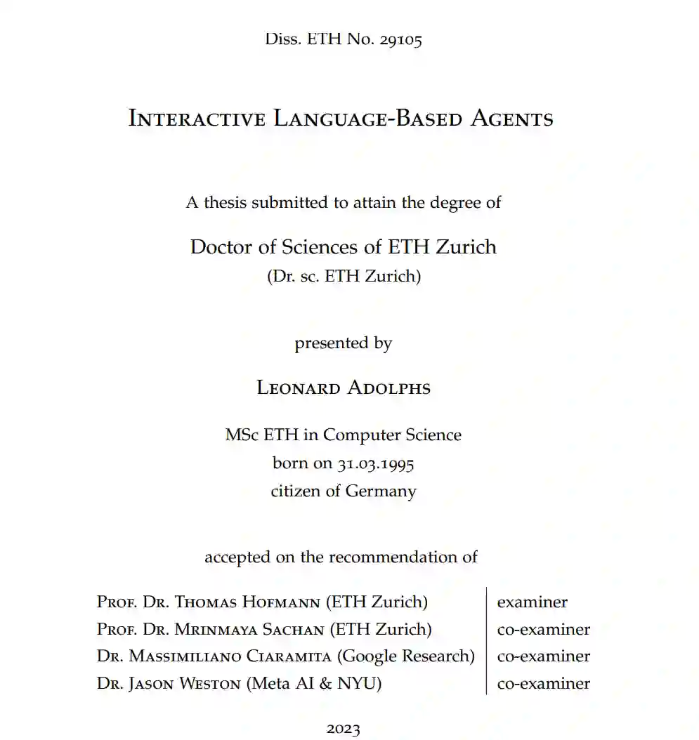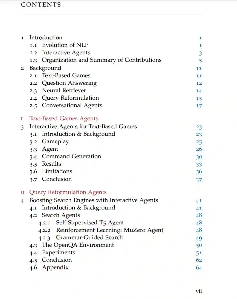 近年来,深度神经网络架构在自然语言处理(NLP)领域取得了显著成就。通过放大模型大小并在互联网上可用的大量文本数据上进行自监督预训练,即使在提供少量具体示例时,也解锁了泛化和复杂推理能力。然而,NLP的大部分进展都是基于静态学习范例进行的,其中模型在固定数据集上进行一次训练以学习特定技能,并在此后保持固定。在本论文中,我们将注意力转向NLP的交互式智能体,即与动态环境或用户互动的基于语言的模型。在三个不同的应用领域,(i)基于文本的游戏,(ii)查询重构,以及(iii)对话,我们调查并开发与不同形式的自适应环境互动的智能体。论文分为三部分,反映了三个应用领域。在第一部分,我们为基于文本的游戏开发了一个深度强化学习(RL)智能体,该智能体能够在结构相似但带有新对象和指令的游戏家族中进行泛化。第二部分重点关注查询重构,我们从两个角度进行研究。首先,我们考虑学习搜索问题,其中智能体被训练为使用自然语言与信息检索(IR)系统互动。观察IR组件的结果,它调整初始用户查询并收集一个改进的证据文档集。在此设置中,我们开发了两个学习成功的交互式搜索策略的智能体:一个通过纯强化学习训练的模型,另一个通过(自我)监督学习。在随后的章节中,我们将注意力转向神经检索模型,并为交互式查询建议开发智能体。为此,我们训练了一个查询解码器模型,该模型在共享段落-查询嵌入空间中的给定点生成相应的文本形式的查询。我们使用此解码器生成方向性查询细化的合成数据集,我们使用它来训练一个强大的重构模型。在论文的最后部分,我们提出了不同的方法来开发对话智能体。我们建议模块化对话模型的架构,以输出随后的模块所基于的中间文本序列。首先,我们表明,在对话响应之前生成知识输出作为中间步骤可以增加在开放域对话中的知识利用和事实正确性。接下来,我们开发了一个依次生成(i)搜索引擎查询,(ii)知识输出,以及(iii)最终响应的单一模型。我们表明,它在知识为基础的对话上超越了先前的最先进的对话模型,并在主题提示完成上超越了具有大量参数的模型。最后,我们探讨在部署后如何改进对话模型,并提出了一个目标,该目标允许在其生成的二进制标记示例上迭代训练语言模型。