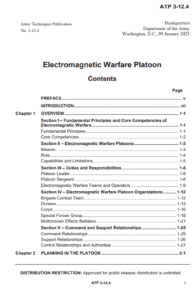 ATP 3-12.4为军团及以下梯队的电磁战排提供技术。该出版物提供了条令指导;描述了排内的关系;定义了组织角色、职能、能力和限制;并确定了电磁战排在军队行动中的责任。