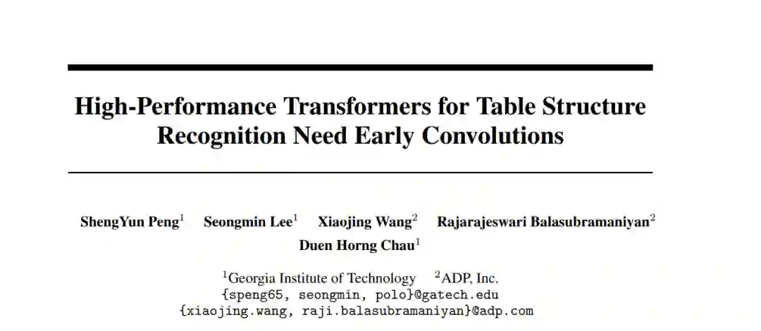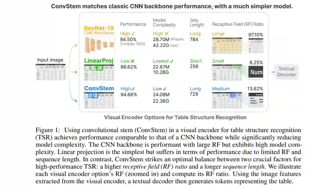 表格结构识别(TSR)旨在将表格图像转换为机器可读格式,其中视觉编码器提取图像特征,文本解码器生成代表表格的令牌。现有方法使用经典的卷积神经网络(CNN)主干作为视觉编码器,以及Transformer作为文本解码器。然而,这种混合的CNN-Transformer架构引入了一个复杂的视觉编码器,占据了模型总参数近一半,显著降低了训练和推理速度,并阻碍了TSR中自监督学习的潜力。在这项工作中,我们设计了一个轻量级的视觉编码器用于TSR,同时不牺牲表现力。我们发现,一个卷积干可以匹配经典CNN主干的性能,而模型更简单。卷积干在两个关键因素之间达到了最佳平衡,这两个因素对于高性能TSR至关重要:更高的接收域(RF)比率和更长的序列长度。这使得它能够“看到”表格的适当部分,并为后续的Transformer“存储”复杂的表格结构,提供足够的上下文长度。我们进行了可重现的消融研究,并在 https://github.com/poloclub/tsr-convstem 上开源了我们的代码,以提高透明度,激发创新,并在我们的领域内促进公平的比较,因为表格是表示学习的有前景的模态。