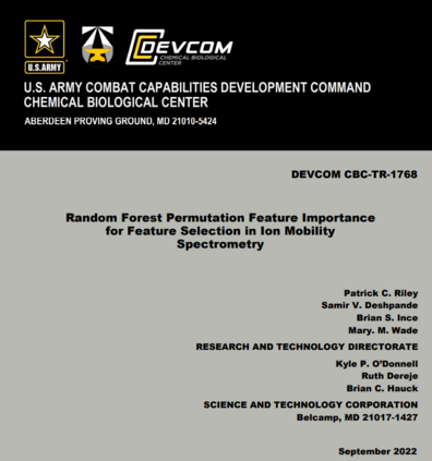 机器学习(ML)可用于对基于离子迁移率光谱(IMS)的化学检测器在检测爆炸物、化学战剂和其他挥发性危险化合物时产生的光谱进行分类。IMS检测器的光谱由漂移时间段(X轴)和其相应的振幅(Y轴)组成。这些值代表了每个光谱中存在的峰值,可以作为特征来训练ML算法。在频谱上进行训练时,特征的总数可以超过1000个,而且是高卡度的。这项工作展示了一种使用随机森林(RF)分类和互换特征重要性的方法,以缩小选择最重要的光谱仓。这些特征是训练数据中常见的峰值位置的代表。使用由RF确定的最重要的特征来减少训练数据集的维度,大大增强了密集神经网络的准确性。