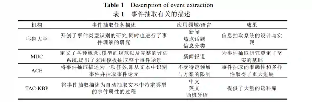 20 世纪 80 年代末,事件抽取的研究开始蓬勃发展,其中耶鲁大学、MUC、ACE 和文本分析会议(TAC, TextAnalysis Conference) [4]的相关测评都推动着事件抽取技术的快速发展,情况如表1 所示.