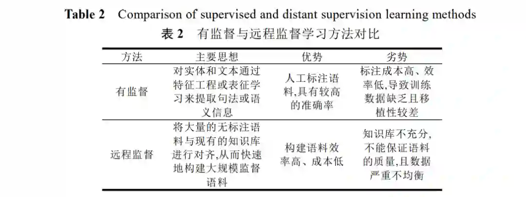 近年来,深度学习技术已广泛用于复杂结构的建模,并验证了对许多 NLP 任务都有效,例如机器翻译[10]、关系抽取[11]和情感分析[12]等.双向长期短期记忆(Bi-LSTM, Bi-directional Long Short-TermMemory)模型[13]是一种双向 RNN,可以捕获前后上下文中每个单词的信息,同时利用其信息对单词表示进行建模.CNN是另一种有效的模型,可以提取事件语义表示同时捕获其结构特征. 事件抽取在应用需求的推动下展开,由人工标注数据的依赖程度可以将目前基于深度学习的事件抽取方法主要分为两类:有监督和远程监督学习方法.有监督学习在训练过程中使用人工标注的数据集,而远程监督的学习方法通过对齐远程知识库自动对语料进行标注来获取带标记语料数据,具体比较情况如表2 所示.