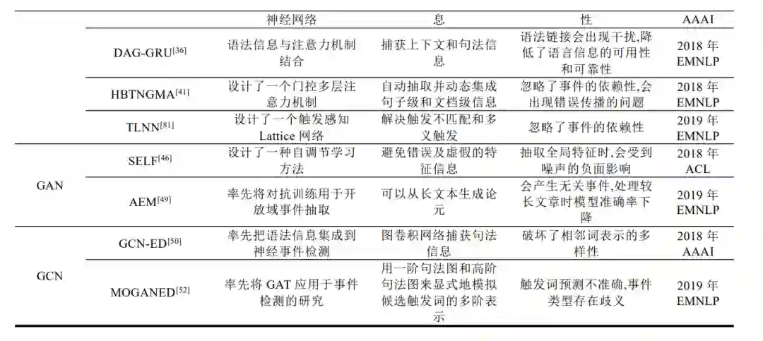 在有监督中运用深度学习方法进行事件抽取,已经成为这几年事件抽取的热门研究方向.表3 整理了深度学习框架下有监督事件抽取的经典模型.其中,模型主要是改进 CNN、RNN 输入特征或网络结构,比如添加不同特征、结合多种注意力机制和引入依存树等挖掘更深层次事件语义信息来提升其性能.下面对相关模型进行深入研究和分析.