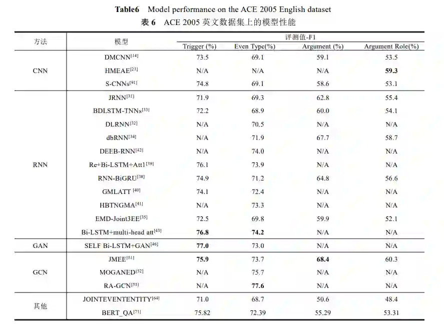 Gangal 等人[72]针对 RAMS 数据集在事件论元抽取中准确率存在较大差距的问题,提出了一种基于预训练BERT 的事件论元抽取方法(BERTering RAMS).实验结果表明,该方法具有较好的跨句准确性.Zhang等人[73]为了减少候选论元数量的问题,提出了一种两步隐式事件论元检测方法,将问题分解为两个子问题:论元头词检测和头跨度扩展,其中编码模块采用了预训练 BERT 进行上下文编码.在 RAMS 数据集上的实验结果表明,该模型获比其他对比模型的性能更好. 在生物医学上识别触发词相关联的嵌套结构化事件时准确率不高,Huang 等人[74]提出了一种基于层次知识图的生物医学事件抽取方法(GEANet-SciBERT).该方法在预训练语言模型 SciBERT [93]的基础上,加入了一种新的图神经网络模型 GEANet 作为补充.在 BioNLP 2011 GENIA 事件抽取任务中,该方法在所有事件和复杂事件上 F1 值分别提高 1.41%和 3.19% .