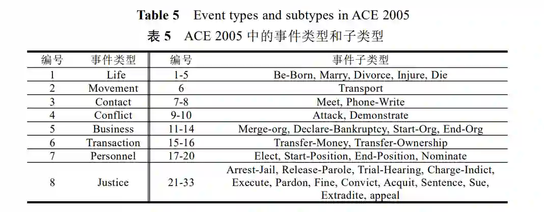 事件抽取中常用的数据集主要包括 ACE 2005、TAC-KBP、BioNLP-ST、GENIA、MLEE 和CEC[86],其中ACE 2005 是应用最广泛的数据集. ACE 数据集是语言数据联盟(LDC, Linguistic Data Consortium)发布的,由实体、关系和事件注释组成的各种类型的数据[2].ACE 2005事件数据集定义了 8 个事件类型和 33个子类型,每个事件子类型对应一组论元角色, 是来自媒体、广播新闻等不同方面的英文、中文和阿拉伯语事件.表 5 描述了相关的事件类型和其子类型.
