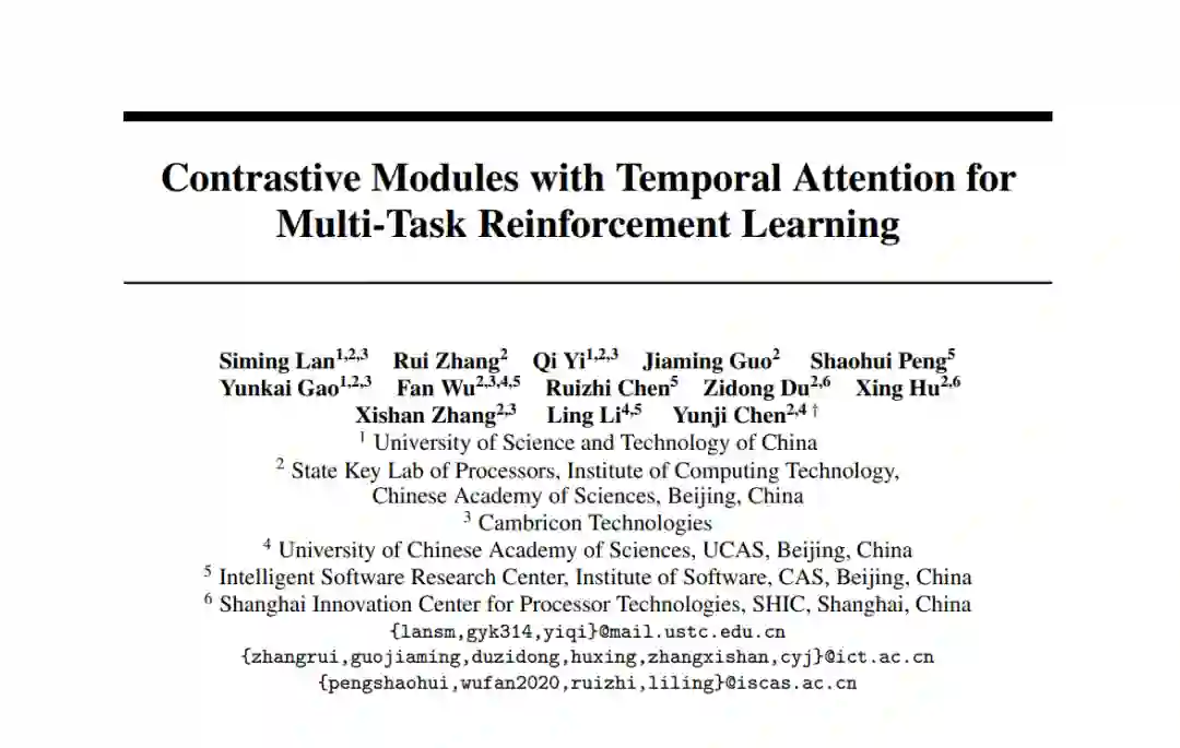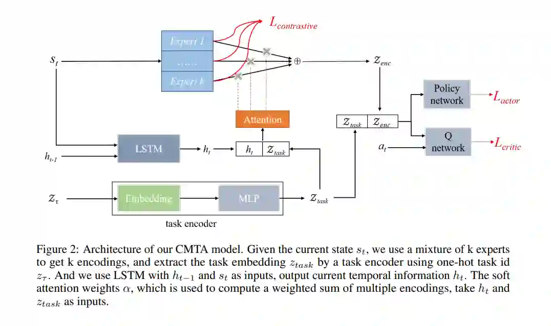 在多任务强化学习领域,模块化原则已被广泛采纳,该原则涉及将功能专业化到不同的模块中,并适当地组合它们,作为预防由于任务间冲突导致的性能降低的有希望的方法。但是,现有的多任务RL方法大多只在任务层面组合共享模块,忽略了任务内部可能存在的冲突。此外,这些方法没有考虑到,如果没有约束,某些模块可能会学到相似的功能,从而限制了模块化方法的表达能力和泛化能力。在这篇论文中,我们提出了具有时间注意力的对比模块(CMTA)方法来解决这些限制。CMTA通过对比学习使模块之间保持差异,并使用时间注意力在比任务层面更细的粒度上组合共享模块,从而减轻了任务内的负面转移,并提高了多任务RL的泛化能力和性能。我们在Meta-World上进行了实验,这是一个包含各种机器人操纵任务的多任务RL基准。实验结果显示,CMTA首次超越了单独学习每个任务,并在基线上取得了大幅的性能提升。