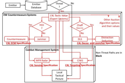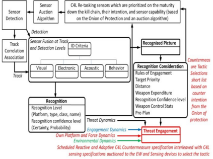 处理不同的或变化的传感器的一种可扩展的方式是,如果所有的设备可以减少不确定性或提供额外的数据来回答一个杀戮链阶段的问题,就将它们定义为传感器。因此,这些传感器可以成为拍卖算法的参与者,以其回答问题的能力来竞标。在不同的操作环境下,拍卖算法中的分数可以改变,因此,不同的传感器选择提供较低的可观察性或与当前的ROE、受限的EMCON或当前的传感器利用相一致。通过这种方式,形成了一个问答循环,完善了对情况的理解,同时在提问的基础上做出增量决定,并使环境情况有利于他们的部队使用保护洋葱的一个版本。此外,同样的拍卖优化可以与反措施一起执行,其概念是,如果一切都能影响当地的杀戮链决策或导致结论或问题发生在受害者身上,那么它就是一个影响者。由此可见,C4L提供了一种以标准形式指定反措施行动和传感规格的方法;这些规格可以一起拍卖,以便在一个可适应的模型中获得最佳效果和传感,然后该模型将优化杀戮链的进展,为跟踪的对手的杀戮链进展提供优势。在图15中,本文展示了EW系统如何在拍卖优化的基础上与具有认知DM的作战管理系统(CMS)集成。威胁的检测/识别/鉴定/分类被转移到不同的数据库中,但这些过程和数据库的不确定性导致了传感器的重新任务。这些都是拍卖,根据传感器解决情况的不确定性的能力来分配任务,并根据紧急程度来确定优先次序;这使用了从保护的角度预测威胁的杀伤链意图。这些过程越可靠,立即识别和反应的概率就越高。为了进一步提高这一结果,管理部门必须考虑机器学习中的其他参数,以适应当地环境的传感任务和对策效果的拍卖。
