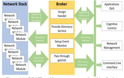 软件架构的一个例子是ADROIT。自适应动态无线电开源智能团队(ADROIT):用中间代理认知控制SDR节点之间的协作。ADROIT项目正在建立一个开源的软件定义的数据无线电,旨在由认知应用程序控制。模块暴露了它的参数和它们的属性(特别是读/写)。当一个模块发生变化时(例如,增加一个新的参数),它只需揭示新的参数,并在一个发布-订阅机制中公开参数(名称、属性),而不是为该新参数增加一个新的API函数;这也可以扩展为一个组播目的地,给后来仍需要定义的模块。ADROIT用图14所示的模块实例化了中间代理。