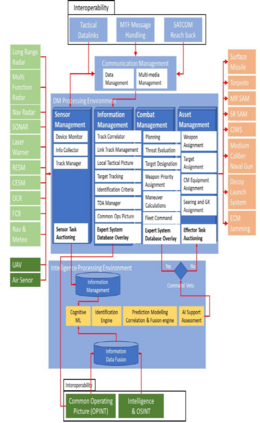 在图17中,本文展示了一个威胁发射器从EW系统进入CMS部分的顺序。从EW系统的库或数据库中识别截获的发射器;该数据库包含物理雷达特征: PRI、频率、PW、振幅、扫描类型、扫描周期平台等级和威胁名称;采集类型的特征,ECCM,如原点干扰(HOJ)Chaffs辨别,红外,双导射频和红外。如果发射物未被识别为威胁,则在本地识别的海上图像中直接代表发行者。如果被确认为威胁,它将遵循不同的路径,如前所述。导弹的获取和ECCM的类型在反应链中具有巨大的价值。如果它有HOJ能力,最好是通过C4L中捕获的特定计算直接干预硬杀伤和诱饵发射;该选定的C4L规格是由保护的洋葱头选择的,它与频谱中的感应计划一起安排。该规格将诱饵定位在C4L所确定的与发射船的一定距离和特定的β值。除了在CMS上表示威胁的到达方向外,EW系统还将C4L搜索数据和传感规范发送到多功能雷达(MFR)和火控雷达(FCR)作为即时硬杀伤系统。本文在图18中画出了由人工智能支持的战斗管理系统(CMS)的架构基础。在标准环境块中,还有四个相互关联的组件: