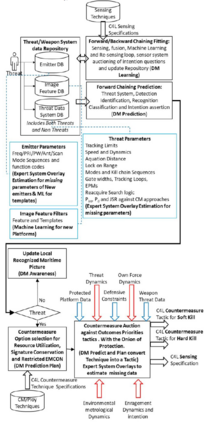 有些参数可能不为人所知,也可能没有方法或传感器来提供这些参数;因此,Rudd-Orthner等人[24]的专家系统的神经网络形式作为数据库的叠加,在这些情况下提供一个估计值。它还可以提供一个由贝叶斯网络进一步引导的值,该网络可以将从环境中收集的传感器事实与来自其规则的知识结合起来,使其不容易被收集的事实所欺骗。此外,在图16中,也是在人工智能的背景下,所提出的架构将EW系统与CMS结合起来。它通过一个反馈回路支持 "态势感知",根据威胁杀伤链的位置重新安排传感器的任务,以快速解决识别和确认的不确定性,更新跟踪的准确性,并为CMS和EW系统资源提供战术清单作为选择。