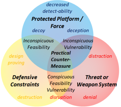 图12中的维恩图显示了数据可用性的 "影响范围":保护平台/部队、威胁或武器系统和防御限制与反措施设计考虑相叠加。Rudd-Orthner等人指出,这些不同的反措施考虑加上不同的可用数据,可能对反措施战术设计形成影响范围。