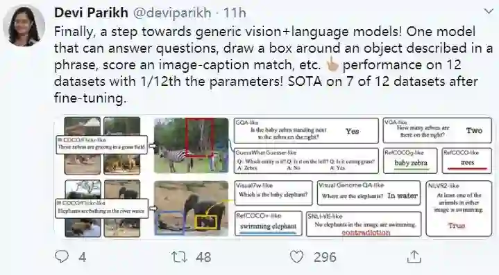 许多视觉和语言的研究集中在一组小而多样的独立任务和支持的数据集上,这些数据集通常是单独研究的;然而,成功完成这些任务所需的视觉语言理解技能有很大的重叠。在这项工作中,我们通过开发一个大规模的、多任务的训练机制来研究视觉和语言任务之间的关系。我们的方法最终在12个数据集上建立了一个模型,这些数据集来自4大类任务,包括可视化问题回答、基于标题的图像检索、基础引用表达式和多模态验证。与独立训练的单任务模型相比,这意味着从大约30亿个参数减少到2.7亿个参数,同时在各个任务中平均提高性能2.05个百分点。我们使用我们的多任务框架来深入分析联合训练不同任务的效果。此外,我们还展示了从单一的多任务模型中细化特定任务模型可以带来进一步的改进,达到或超过最先进的性能。