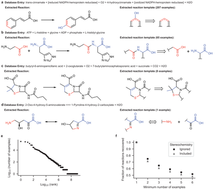 使用 RDChiral,总结每个反应化学的反应模板自动从这些原子映射反应中提取为广义 SMARTS字符串(示例如图 2a-d 所示)。总共7984个独特的反应模板足以描述15309个酶促反应。此方法为每个反应生成一个模板,其中包含手性信息和反应中心周围启发式确定的可变数量的上下文。选择这种基于模板的方法是为了在逆合成建议和数据库中的先例反应之间保持联系。