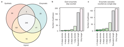 为了更好地了解作者的多模型算法的搜索空间与单模型算法的搜索空间相比,作者使用仅由合成的、只是酶促的或两种模板优先排序模型。他们比较了每次搜索能够识别合成途径的分子数量和每个目标分子发现的最短合成途径中的步骤数(图 6)。