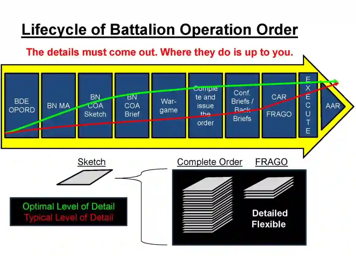 排级单位可通过标准化战斗操典减轻细节压力——从集结区到目标区的展开、火力支援、接敌反应等均属操典范畴。连长职责是选择适用操典序列,临机调整应对变化。营级计划则需协调各连时空部署,整合旅级作战框架,统筹所有作战职能的时序、触发条件、任务目标与关联图示——即细节编织。