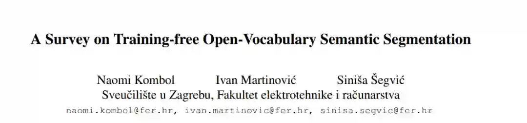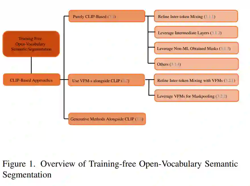 本综述将系统回顾训练自由的开放词汇语义分割的发展历程、关键概念、方法演化及当前最新研究成果,重点介绍如何利用现有的多模态分类模型来实现该任务。我们首先对任务定义进行简要介绍,随后梳理常见的模型范式,并详细介绍30余种代表性方法,它们大致可分为以下三大研究方向:纯基于 CLIP 的方法、结合辅助视觉基础模型的方法,以及依赖生成式方法的方案。