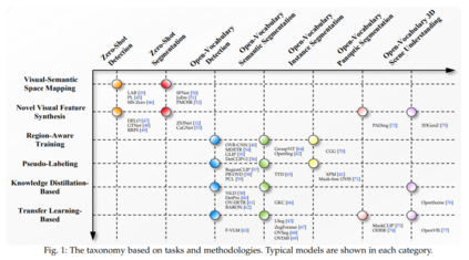在这篇论文中,我们对不同任务和设置进行了全面的回顾,包括零样本/开放词汇检测,零样本/开放词汇语义/实例/全景分割,以及三维场景和视频理解。为了组织来自这些多样化任务和设置的方法,我们需要回答一个问题:如何建立一个分类系统,可以区分零样本和开放词汇的设置,同时抽象出跨任务的通用方法学?我们发现,是否允许访问弱监督信号,以及如果允许,如何利用它们是分类的关键。因此,我们根据任务和方法学构建了一个分类系统,如图1所示。零样本和开放词汇的设置是通过允许弱监督信号的访问与否来区分的,并且不同任务在每个设置下共享相同的方法学。不同方法学的一般框架总结在图2中。