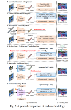 新颖的视觉特征合成。由于先前方法中缺乏未知类别的注释,对于未见类别的置信度常常被已见类别的样本所淹没。为了缓解偏置问题[78],这种方法利用了额外的生成模型[79],[80],[81],根据语义嵌入和随机噪声向量来合成假的未见视觉特征。生成损失的目标是逼近真实视觉特征的潜在分布。然后在纯粹的真实已见和生成的未见视觉特征上重新训练检测或分割头中的分类器嵌入。一旦允许访问弱监督信号,OVD和OVS方法可以主要分为以下四类: