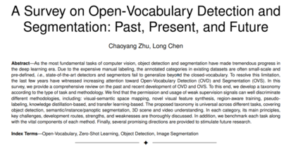 随后,新提出的开放词汇检测(OVD) [40]和分割(OVS) [41],[42],[43]允许模型在带有未标注新对象的图像上进行训练。它们通常通过弱监督信号来解决封闭集合的限制,例如图像-文本对(图像标题或图像级标签),或者来自大型预训练的视觉-语言模型(VLMs),如CLIP [44]。来自CLIP [44]的文本嵌入可以很好地与视觉模态对齐。因此,与ZSD和ZSS相比,OVD和OVS在性能上取得了巨大的飞跃。由于其巨大的应用价值,近年来提出了大量的方法,使得研究人员难以跟上它们的步伐。然而,据我们所知,目前只有少数相关综述可用,而这些综述只关注于有限的任务和设置,因此迫切需要一份更全面的综述,涵盖所有任务和设置。