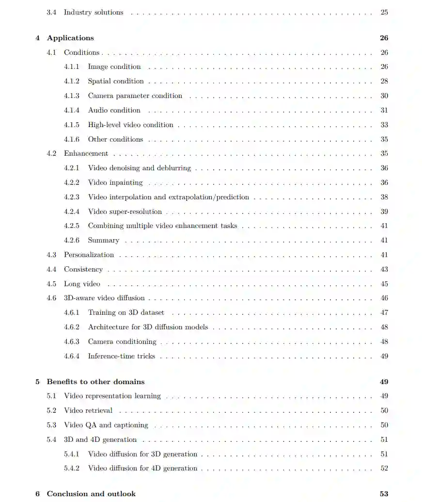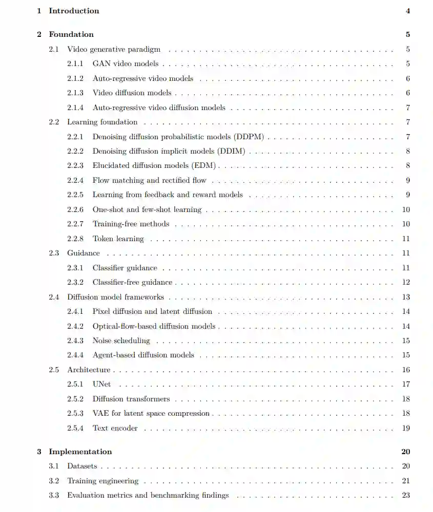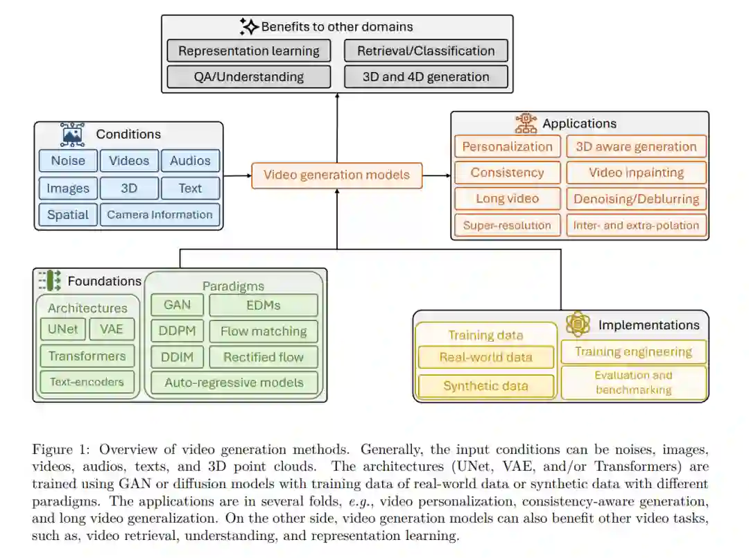 本文结构如下:第2节介绍基础概念,涵盖GAN模型、自回归模型与扩散模型等视频生成范式;第3节聚焦于实现细节,讨论数据集、训练工程技术、评估指标,并通过基准测试展示模型性能;第4节介绍多样化应用场景,包括条件生成任务、视频增强方法(如去噪、修复、插帧、外推与超分辨率),以及个性化生成、一致性建模、长视频生成和新兴的三维感知扩散模型;最后,第5节探讨扩散视频生成在其他领域的推动作用,如视频表征学习、检索、问答系统以及三维/四维生成,强调其在相关领域的广泛影响。 这一结构将为读者提供从基础原理到前沿应用的全面、系统的理解。