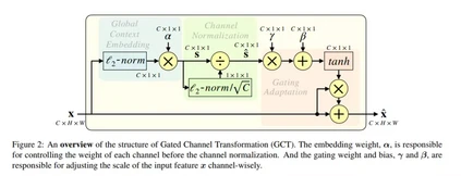 本文针对深度卷积神经网络提出了一种常规的、易应用的变换单元,即Gated Channel Transformation (GCT) 模块。GCT结合了归一化方法和注意力机制,并使用轻量级的、易于分析的变量来隐式地学习网络通道间的相互关系。这些通道量级的变量可以直接影响神经元间的竞争或者合作行为,且能方便地与卷积网络本身的权重参数一同参与训练。通过引入归一化方法,GCT模块要远比SE-Nets的SE模块轻量,这使得将GCT部署在每个卷积层上而不让网络变得过于臃肿成为了可能。本文在多个大型数据集上针对数种基础视觉任务进行了充分的实验,即ImageNet数据集上的图片分类,COCO上的目标检测与实例分割,还有Kinetics上的视频分类。在这些视觉任务上,引入GCT模块均能带来明显的性能提升。这些大量的实验充分证明了GCT模块的有效性。