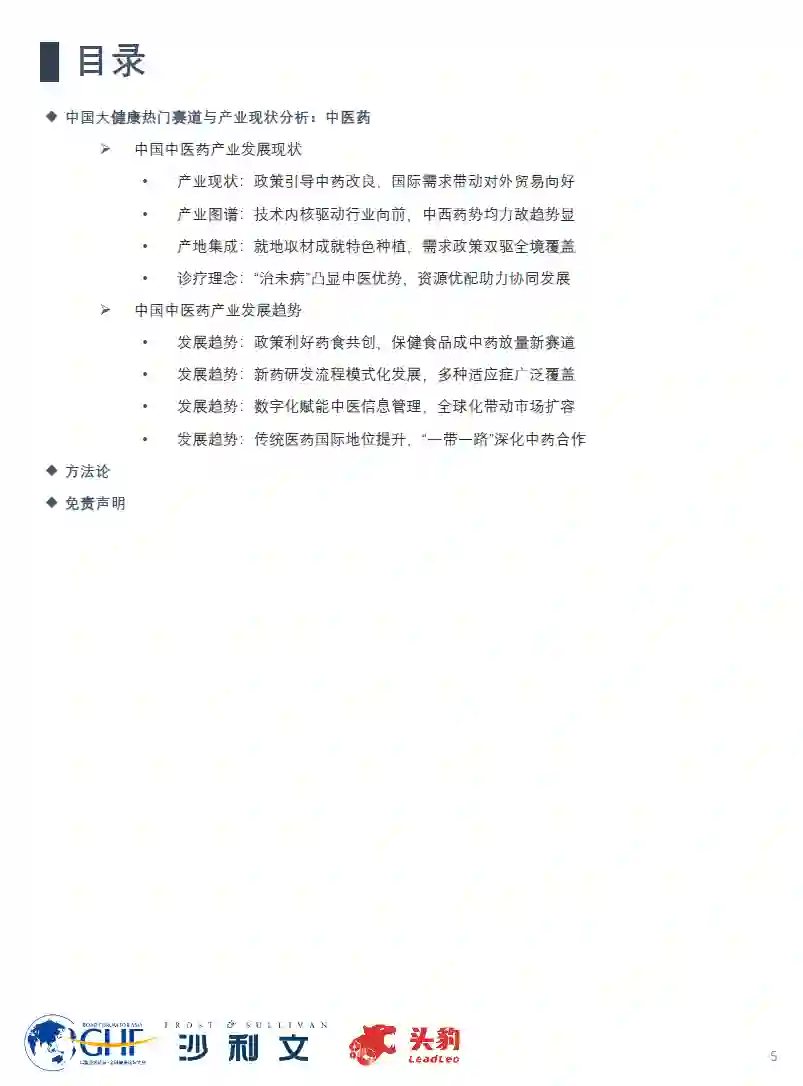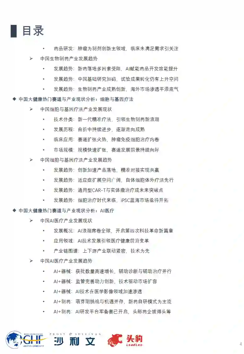 医疗大健康产业发展环境 当前全球环境瞬息万变,本土医疗健康产业边界拓展与结构优化路径存在挑战。在此背景下,中国人口结构老龄化及健康意识提升为医疗产业带来持续扩张的市场需求,同时监管政策直指慢病管理与医疗保障体系优化,为产业加速发展转型提供稳健支撑。全球多议题的发起将中国医疗健康的坚韧表现广泛传播,助力中国在世界舞台以多维优势大放异彩。 热门赛道一:生物制药 生物制药产业正在经历由仿创结合和向自主创新转变的发展黄金期。政策引导、科研发力及国际合作的加强为行业质量提升和全球竞争力增强奠定基础。随着国产创新药的快速发展和人工智能等技术的成熟应用,中国生物制药正向着国际化市场加速迈进。 热门赛道二:细胞与基因治疗 细胞与基因治疗作为医疗医药板块的新兴赛道,已形成对传统治疗模式的颠覆性革新。中国市场在技术研发发力和利好政策支持的推动下,正在逐步缩小与国际领先水平的差距。长期来看,治疗需求引导结合前沿技术攻破,细胞与基因治疗方案将成为中国医药产业的重要增长点。 热门赛道三:AI医疗 AI医疗赛道的快速发展标志着中国医疗服务智能化和数字化转型的新趋势。随着本土计算机算法和算力的持续迭代,以及监管体系的不断完善,搭载AI的医疗产品获批提速并有望在日常诊疗场景中形成深度渗透,由此推动中国医疗健康产业的新一轮变革。 热门赛道四:中医药 伴随全球市场健康管理理念的转变和中医药国际化战略的推进,中国中医药产业正迎来全新的发展机遇。传统医药文化底蕴的长期积累结合专业人才培养机制的逐步完善,为中医药产业的现代化和全球布局奠定了坚实基础。