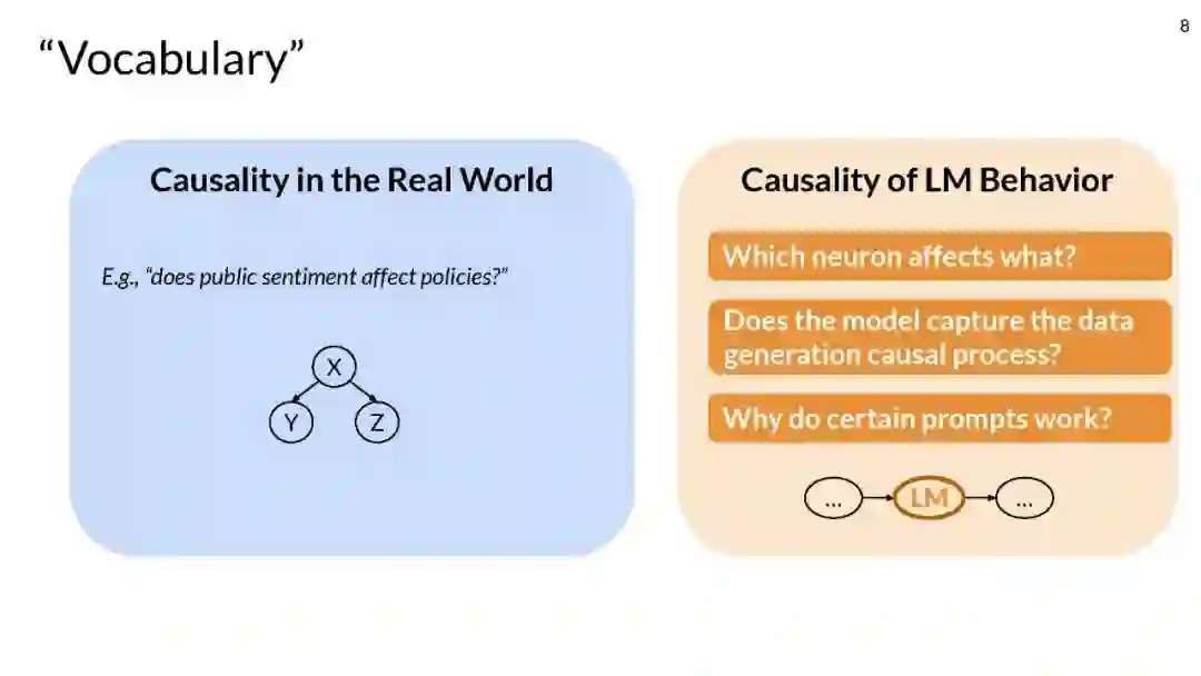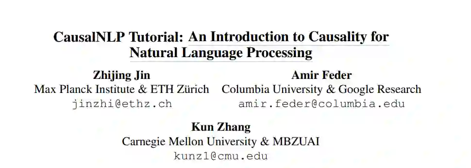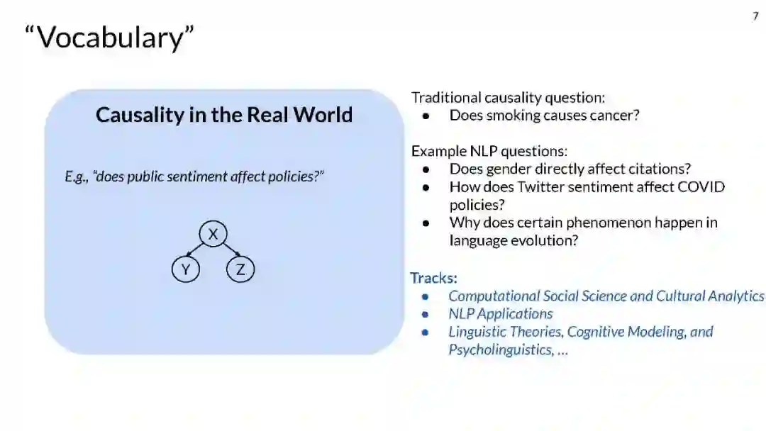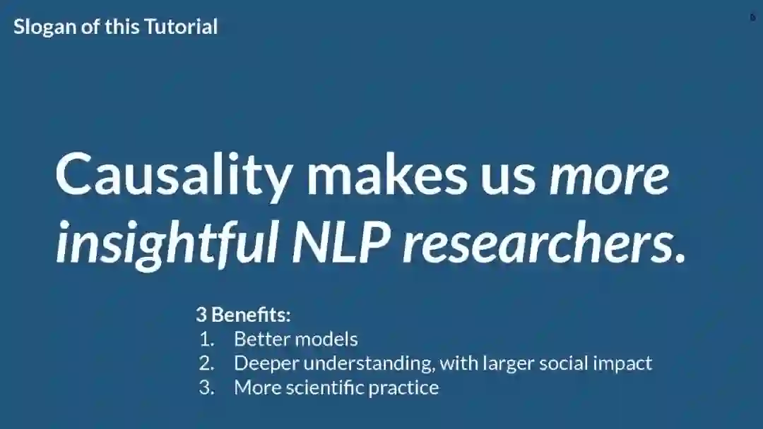 本入门教程旨在向NLP研究社区介绍因果关系。虽然因果关系在科学研究中发挥着重要作用,但直到现在才开始传播到NLP社区。这就是为什么本教程将首先重点介绍因果关系及其重要性和NLP社区的相关性。然后,我们将深入因果关系和NLP的交集,并将其划分为两个不同的领域:使用因果形式使NLP方法更具可解释性、鲁棒性和公平性,以及发现涉及文本变量的社会现象中的因果关系。相应地,我们将教程的内容分为以下三个部分:
