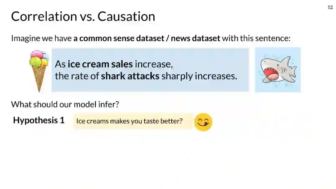 **2. 因果关系有助于改进NLP模型。**在教程的这一部分,我们将首先通过介绍因果视角为什么以及如何帮助机器学习或人工智能任务来激励观众(Schölkopf et al., 2021; Pearl and Bareinboim, 2011; Schölkopf et al., 2012; Zhang et al., 2013, 2020)。简而言之,尽管深度学习模型通过在预测任务中使用相关性取得了令人印象深刻的性能,但在鲁棒性、可解释性和公平性方面仍有局限性,可以使用因果关系来改善。有了这些动机,我们将因果公式扩展到NLP。本文将确定并强调NLP方法中现有的局限性,并提出三个应用领域,其中因果思想可能有所帮助:可解释性(Guidotti等人,2018)、鲁棒性(例如,McCoy等人,2019)和公平性(例如,Zhao等人,2017)。对于每个潜在的应用领域,我们将强调因果思维在解决NLP中的重要开放问题中的相关性(Feder et al., 2021c; Veitch et al., 2021; Kilbertus et al., 2017)。