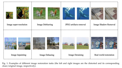 图像恢复(IR)一直是低层次视觉任务中的长期研究主题,在提高图像的主观质量方面发挥着不可替代的作用。流行的IR任务包括图像超分辨率(SR)[1-10]、去模糊[11-17]、去噪[18-25]、修复[26-31]和压缩伪影去除[32-38]等。一些IR任务的视觉示例显示在图1中。为了恢复扭曲的图像,传统的IR方法将恢复视为信号处理,并从空间或频率的角度使用手工制作的算法减少伪影[18, 39-44]。随着深度学习的发展,众多IR工作为各种IR任务定制了一系列数据集,例如,用于SR的DIV2K [45]、Set5 [46]和Set14 [47],用于去雨的Rain800 [48]、Rain200 [?]、Raindrop [49]和DID-MDN [50],以及用于运动去模糊的REDS [51]和Gopro [52]等。利用这些数据集,大多数近期的工作[1-3, 7-11, 13, 16, 19, 21-23, 32-34, 53-55]专注于通过基于卷积神经网络(CNNs)[56]或Transformer [57]的精心设计的骨干网络来提高IR网络针对复杂退化的表示能力。尽管这些工作在客观质量(例如,PSNR和SSIM)上取得了卓越的进展,但恢复的图像仍然受到不满意的纹理生成的困扰,这阻碍了IR方法在实际场景中的应用。